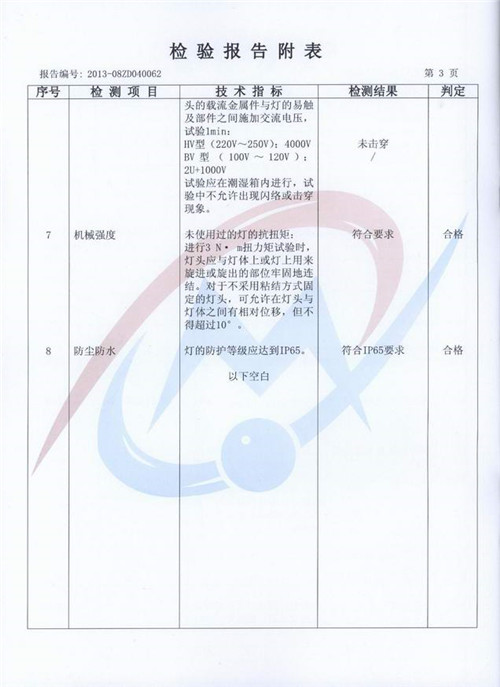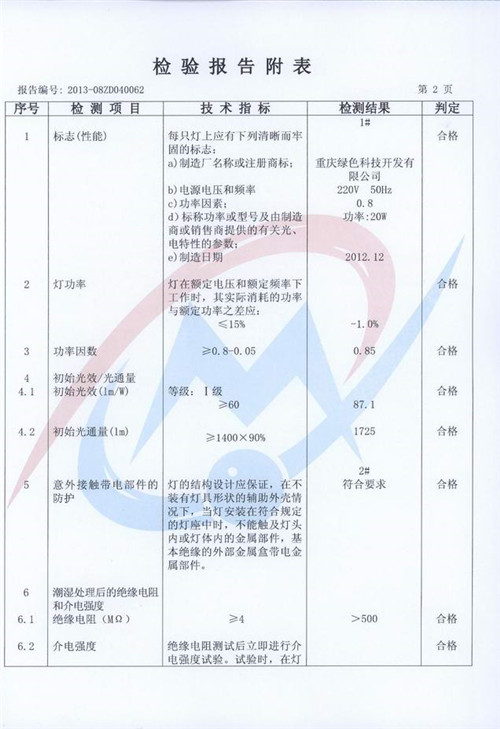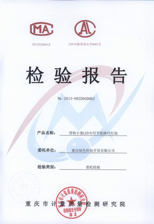 Our independent research and development, manufacturing of the "ten Hui card" Beijiexiaoxiang integration easy special LED energy saving lamp bulb "(color temperature: 4500K, power: 20W), recently, by the Chongqing Academy of Metrology and quality inspection in accordance with GB/T, 24908-2010, 24906-2010 and GB were detected by GB, 7000.1-2007 Standard Test results: (1) high light efficiency: lamp luminous flux is 1725lm, light efficiency is 87.1lm/W; (2) good quality: road vertical facade lighting illumination 9.6lx Road, vertical plane illumination is more than 15lx; (3) good protective performance: waterproof and dustproof grade IP65; (4) power factor: 0.85; (5) good heat dissipation performance light weight: wind tunnel, fin fin radiator, thermal conductivity is 226{W/ (M. C)}, the whole light weight is less than 400g; (6) good color: color index 71; (7) a small decline: This product at 75 degrees of temperature in the oven Continuous light (equivalent to 3 months under normal conditions for 2 years) decay is only 6%. All the items inspected are in conformity with the national standards and obtained the certificate of inspection report issued by Chongqing Institute of measurement and quality inspection.